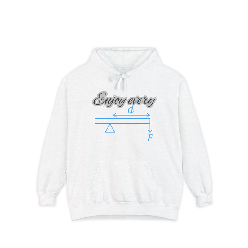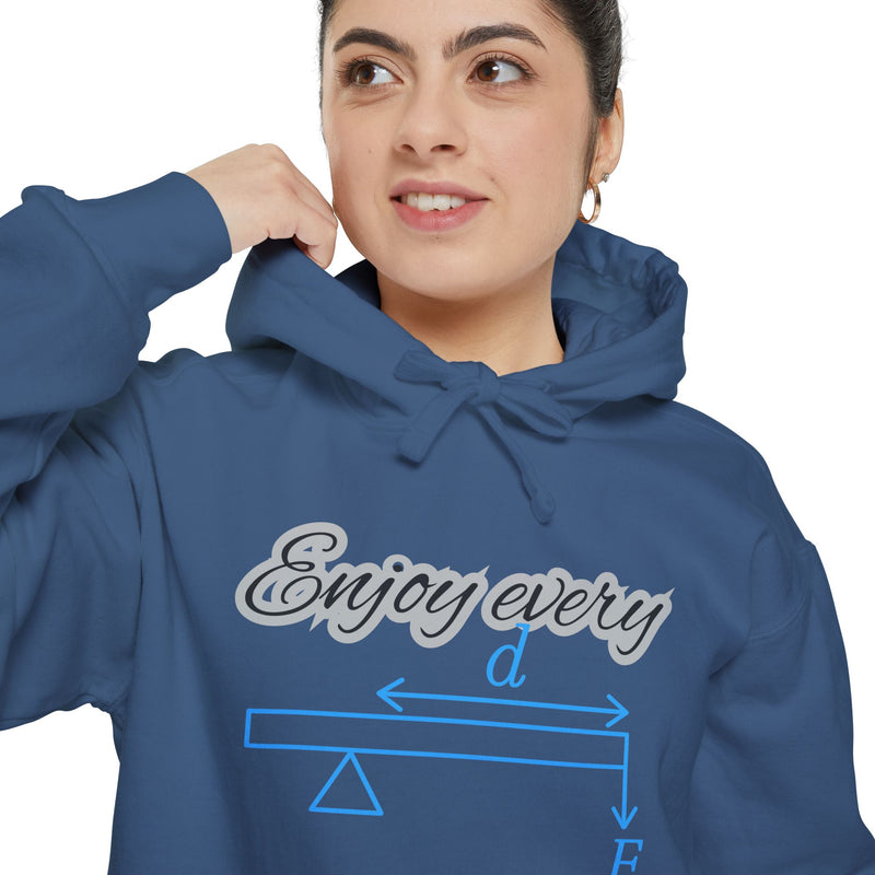 Wear a quiet wink for the curious mind. This garment-dyed hoodie pairs a soft, dense fabric with a minimalist engineering diagram and the script phrase “Enjoy every Moment” — a small, clever nudge to savor the process as much as the result. The relaxed fit and heavy 9.5 oz cotton blend make it feel substantial and lived-in from the first wear. Throw it on for late-night study sessions, field measurements, lab nights, or coffee-shop problem solving. The hood’s jersey lining and flatcord keep things cozy while the ribbed cuffs and hem hold shape through repeats and washes. It’s for people who appreciate precision, subtle humor, and clothing that moves with their work and curiosity.